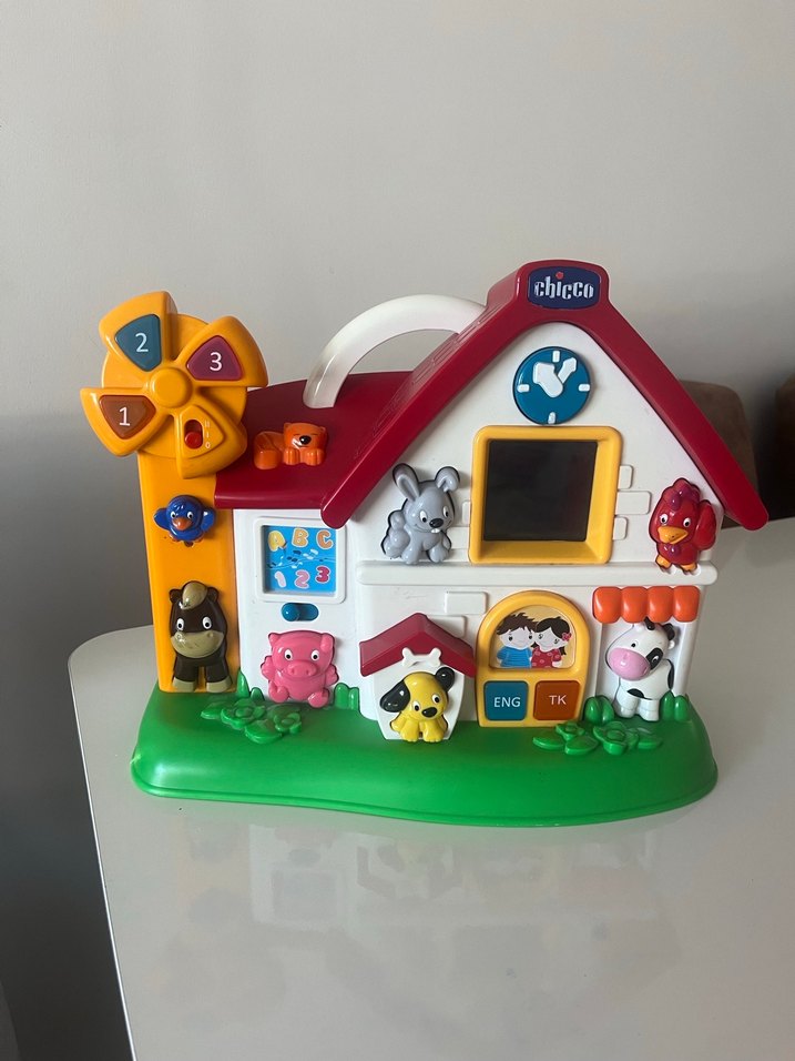 Chicco markalı, renkli ve eğitici oyuncak ev, interaktif hayvan figürleri, saat ve sayı düğmeleri içerir.
