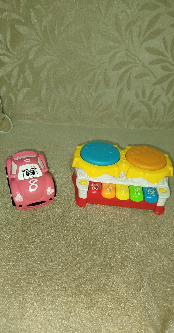 Pembe oyuncak araba ve piyano ile davullardan oluşan renkli eğitici oyuncak seti, çocukların öğrenmesini ve oynamasını sağlar.(Oyuncak piyanonun üzerindeki sağdaki davul bazen tutukluk yapabiliyor çözümü ise basit, soldaki davula basmak.) Her halükarda uygun sayılabilecek oyuncaklar şuanda fiyat olarak. Araba chicco markalıdır aynı zamanda.