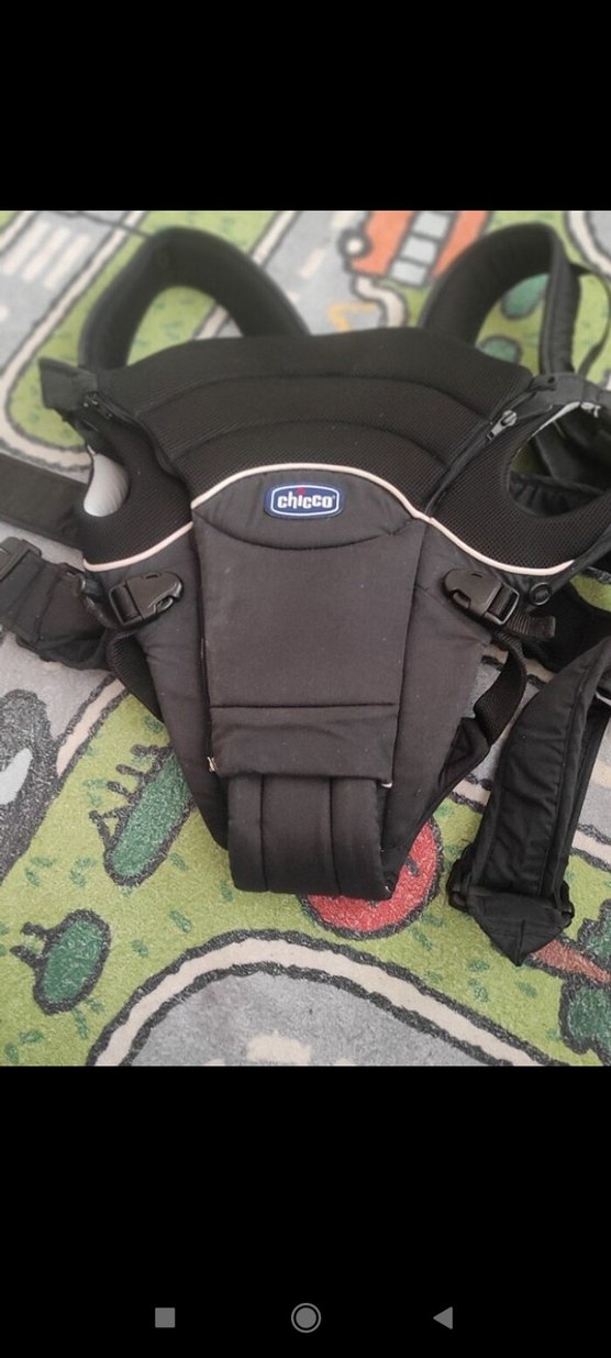 Chicco marka siyah bebek taşıyıcı, rahat ve güvenli taşıma için dolgulu askılar ve sağlam tokalar içerir.