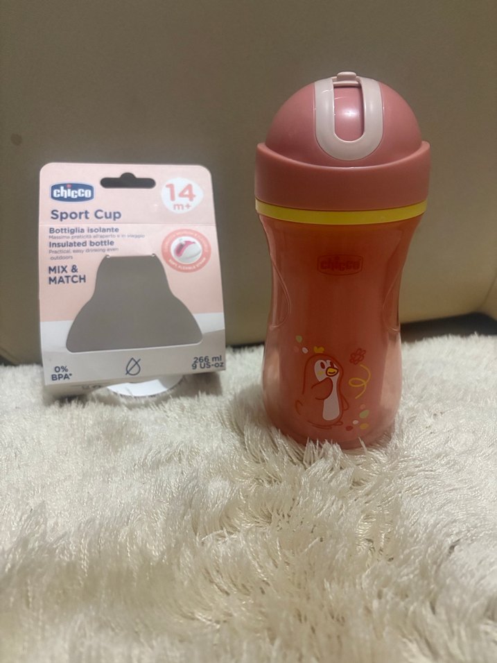 Chicco Sport Cup, pastel pembe renkte, yalıtımlı ve dökülmeyi önleyen kapaklı, 14 ay ve üzeri bebekler için uygundur.