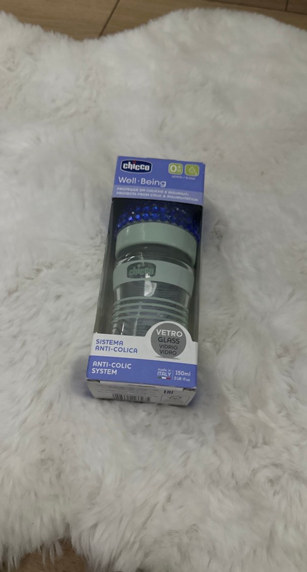 Chicco Well-Being cam biberon, 150 ml kapasiteli ve anti-kolik sistemlidir. Gri ve mavidir.