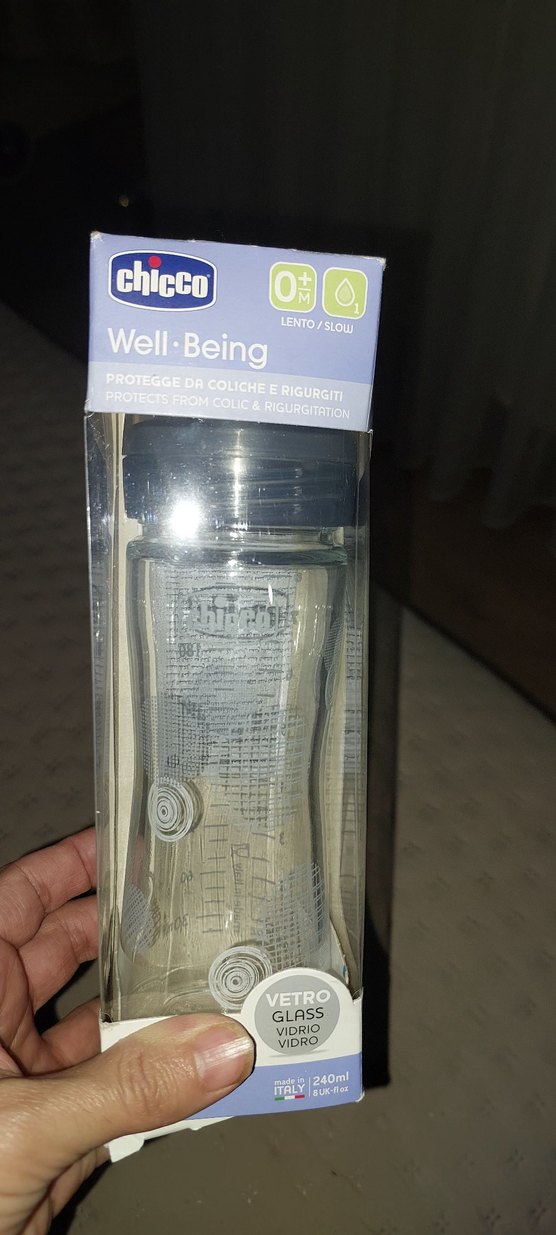 Chicco Well-Being markalı, kolik ve kusmayı önlemeye yardımcı yavaş akışlı emzikli bebek biberonu. 0+ ay için uygun, gri ve beyaz renklerde. Ürün camdır