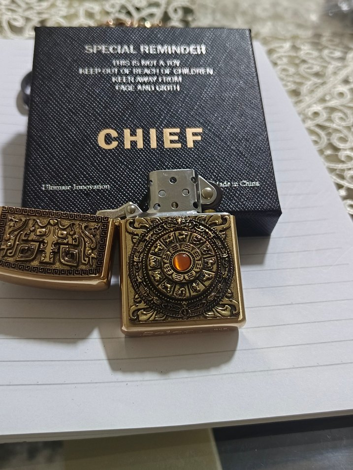 Parlak altın renkli bu çakmak, detaylı işlemeler ve ortasında turuncu taş ile siyah CHIEF kutusunda sunuluyor. bay bayan kullanıma uygun ister koleksiyon ister kullanımlık