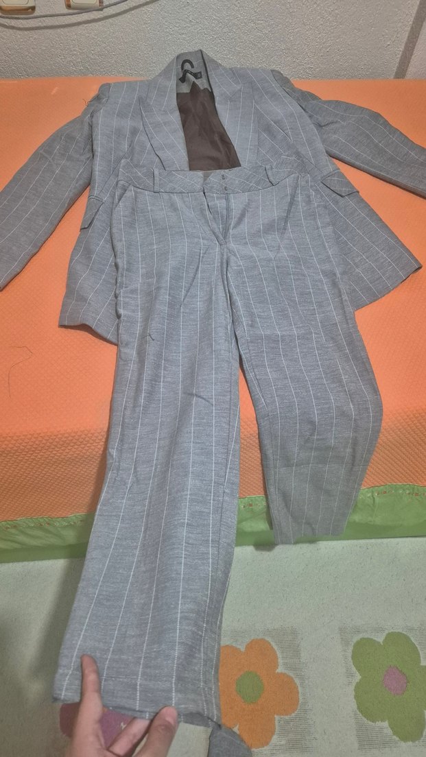 Gri renkli, çizgili ceket pantolon takım. bej çizgili desene sahip, ofis için uygun.
