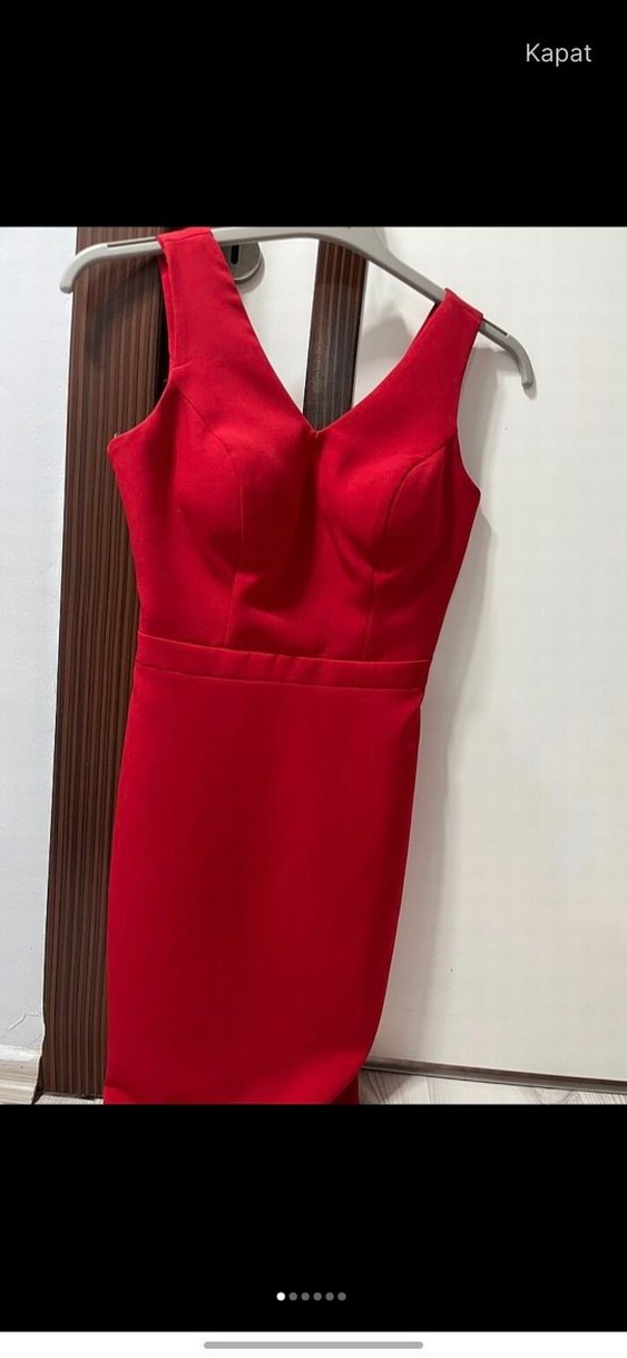 Parlak kırmızı renkte, V yaka ve kolsuz tasarıma sahip, dar kesim elbise. ofis ve özel günler için uygundur.