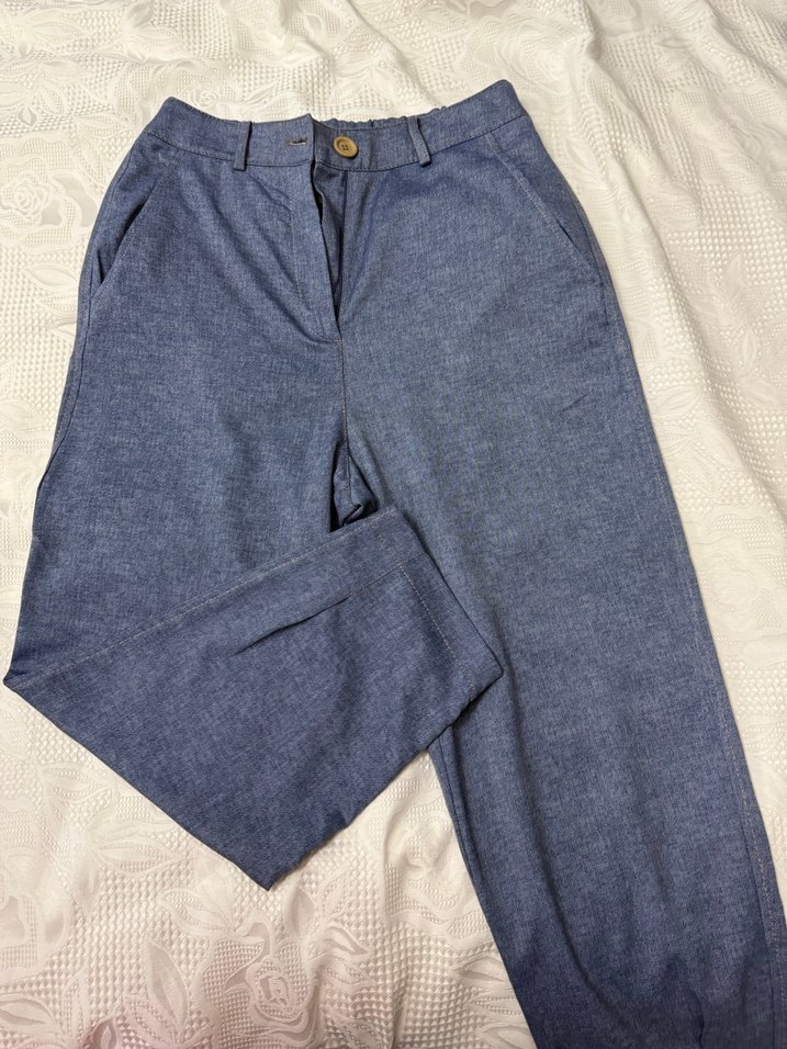 Düğmeli, midi boy, gri mavi tonlarında, rahat kesim kadın denim pantolon. Günlük kullanıma uygundur.