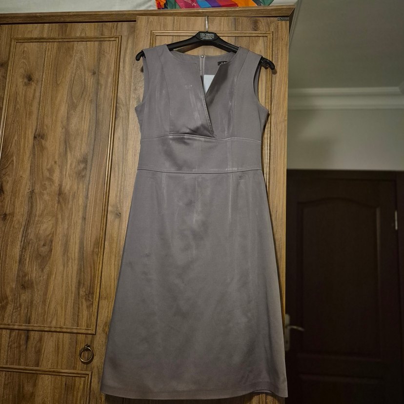 Ofis kullanımı için uygun, drapeli V yakalı, kolsuz ve regular fit gri diz altı elbise. Düz ve modern görünümlü kumaş kullanılmış.