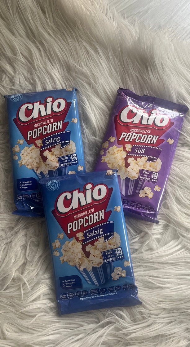 Chio mikrodalga patlamış mısır, pastel mor ve mavi ambalajda, tuzlu ve tatlı çeşitleriyle. Hızlı atıştırmalık için kolay hazırlanır. Adet fiyatı