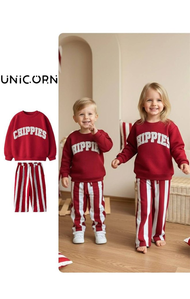 Kız çocukları ve erkek çocukları için bol kesim, uzun kollu, şişme kırmızı sweatshirt ve çizgili pantolon takımı. Yuvarlak yaka sweatshirt, renkli baskılı yazılarla, yumuşak ve sıcak kumaştan üretilmiştir. CHİPPİES TAKIM 3 iplik Bedenler 3 4 yaş 7 8 yaş Ürün Fiyatı 470₺