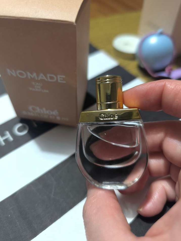 Chloé Nomade kadın parfümü, altın kapaklı şeffaf cam şişede, zarif bir koku sunar. 5 ml minyatür