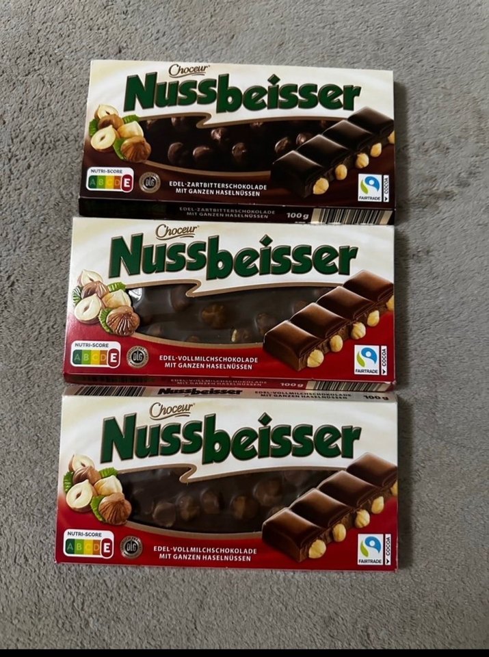 Chocour Nussbeisser set, tam fındıklı ince çikolata barlarından oluşur. Koyu ve sütlü çikolata çeşitleri içerir.