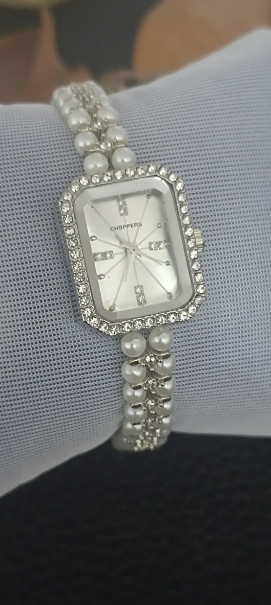 Beyaz inci detaylı bilezik ve kristal süslemeli dikdörtgen kadranı ile klasik zarafeti modern çizgilerle buluşturan kadın saati. ⌚ 134