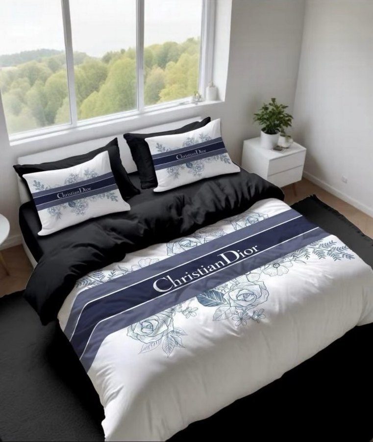 Christian Dior baskılı beyaz ve siyah nevresim seti, çiçek desenli baskılı tasarımla yatak odanıza şıklık katıyor.