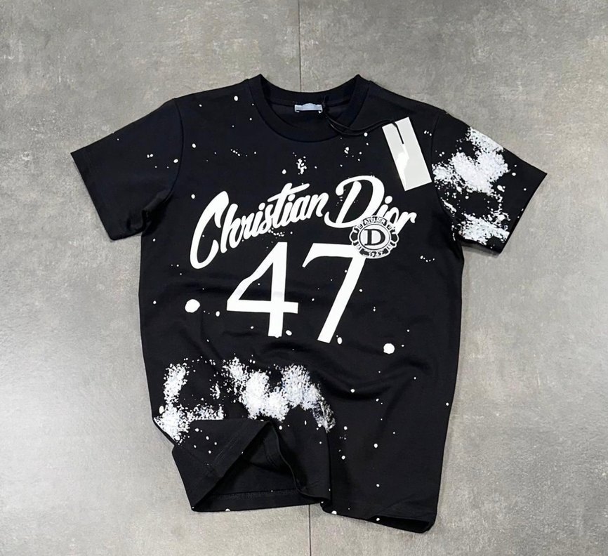 Christian Dior baskılı siyah erkek tişört, kısa kollu ve yuvarlak yaka. Rahat kesimli, sokak stiline uygun günlük kullanım için ideal.