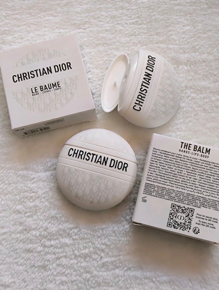 Christian Dior Le Baume el kremi, dokulu desenli yuvarlak beyaz kapta, ellerin nemlenmesi için zengin bakım sağlar.