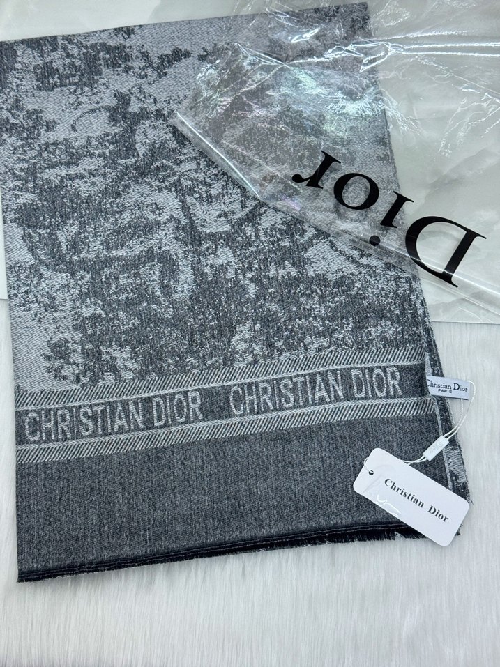 Gri pamuk örgü kumaştan yapılmış, kenarında 'Christian Dior' yazısı bulunan kadın şal. Rahat ve trend sokak stiliyle uyumlu. ✨
