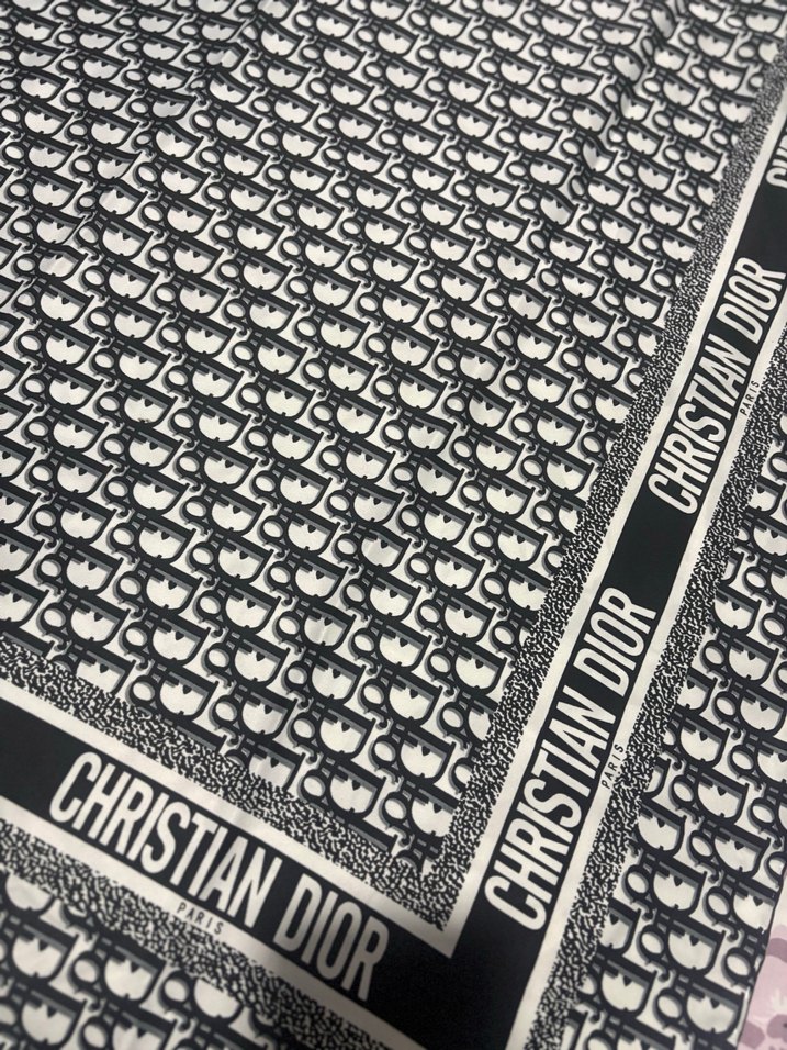 Siyah pamuklu fular, Christian Dior baskılı deseniyle Parisli karşı kültür stilini yansıtıyor. Bir kez takınıldı ithal üründür
