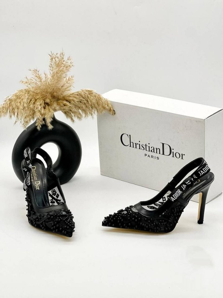 Christian Dior siyah boncuk işlemeli stiletto topuklu ayakkabı, markalı bantlarla süslenmiş. Düğün ve özel günler için uygun, çağdaş tarzda.