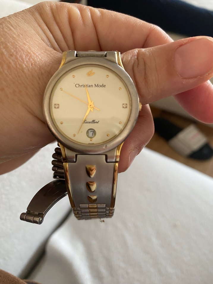 Christian Mode markalı, altın ve gri renkli, düğmeli tasarıma sahip erkek saati. Tarih göstergeli, modern klasik stile uygun bir model. ⌚