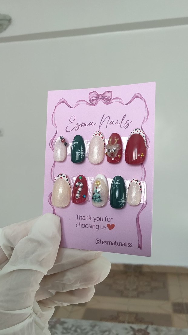 Esma Nails tarafından sunulan, farklı desen ve taş detaylarına sahip pastel pembe tırnak süslemeleri. Kart üzerinde teşekkür notu ve Instagram hesabı yer alıyor.