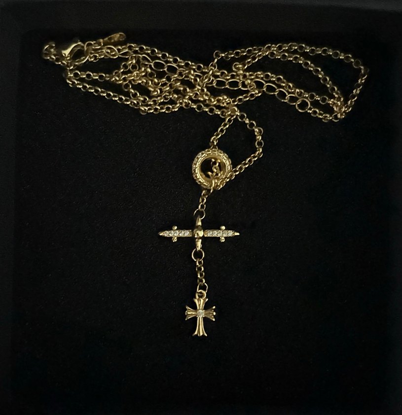 Uzun zincirli, detaylı altın renkli gotik stil haçlı kadın kolyesi, sade günlük kullanım için uygundur. ✨
