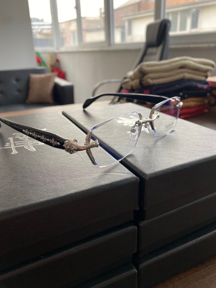 Boncuk işlemeli, altın detaylı koyu renkli klasik kadın gözlüğü. Çerçevesiz camlarıyla çağdaş ve zarif bir görünüm sunar.