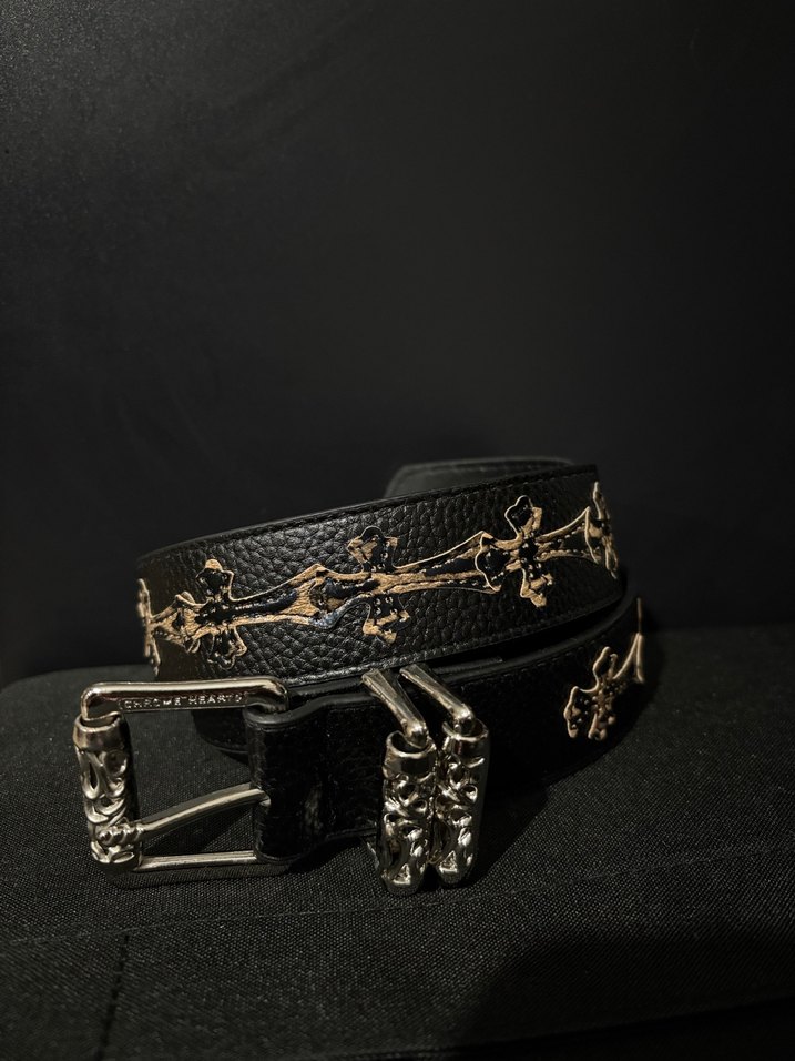 Altın gotik haç detaylı siyah deri kemer, gümüş tokalı, rock punk tarzlarına uygun.