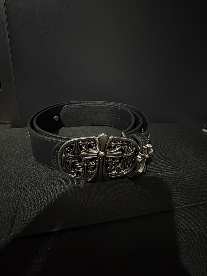 Gotik tarzda, haç desenli tokalı siyah deri kadın kemeri. Tokalı tasarımıyla sağlam ve şık durur.