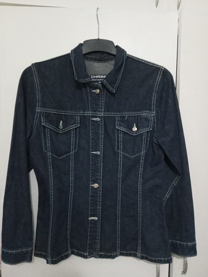 CHRONO markalı, gri renkte, 'Jeans & sportswear' yazılı erkek kot ceketi. Sokak modasına uygun, M beden.