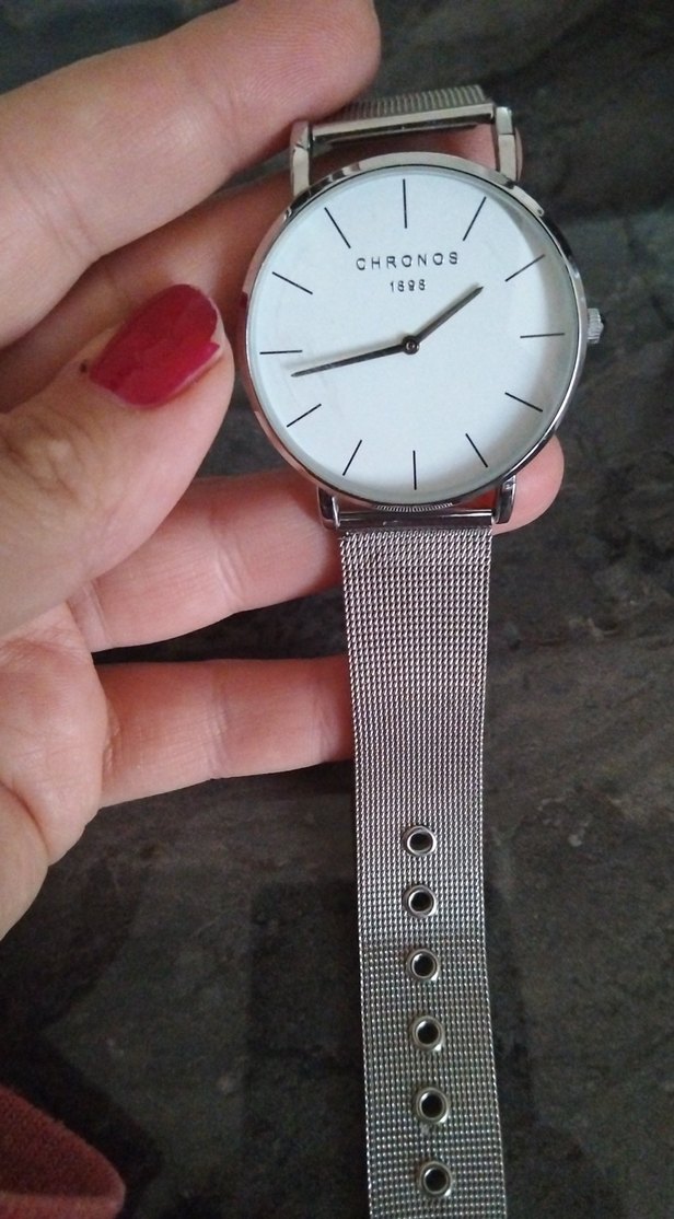 CHRONOS marka, beyaz sade kadran ve gri tokalı file kayışlı minimalist kadın kol saati. Trendy ve sokak stiline uygun. ⌚Sadece pili yok