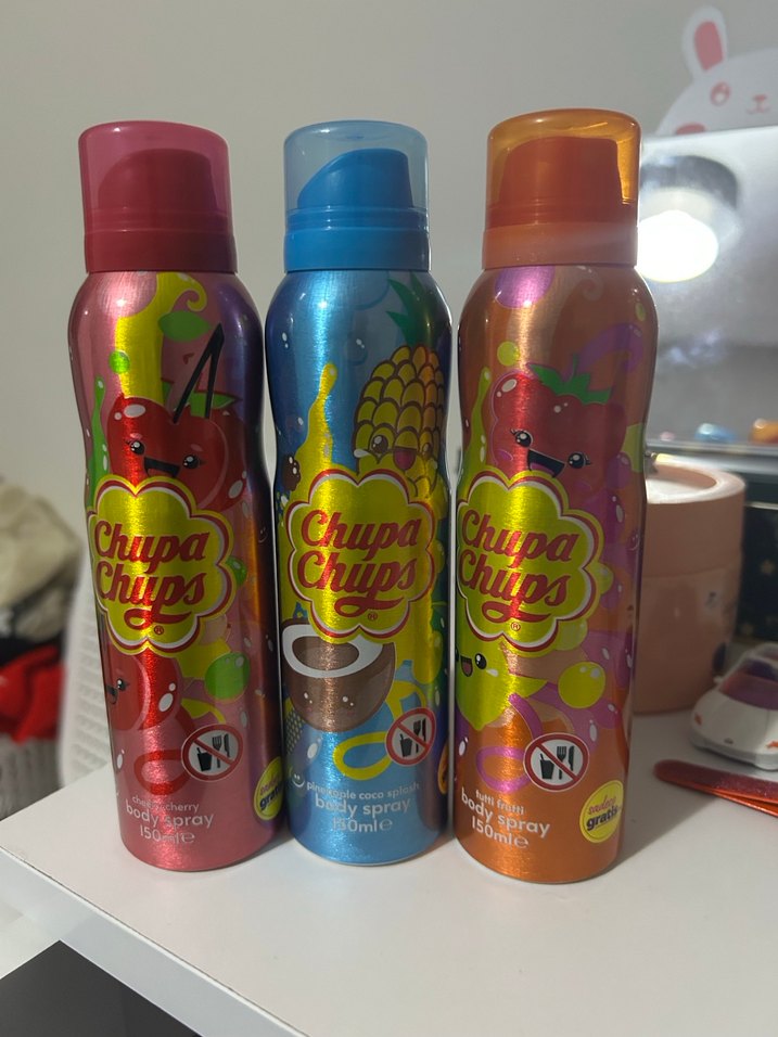 Chupa Chups kadın deodorantları üç meyveli koku seçeneğiyle: kiraz, hindistan cevizi-ananas ve portakal. Her biri 150 ml sprey, ferah ve hoş koku sağlar.
