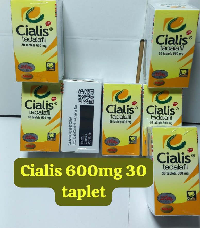 Cialis tadalafil 600 mg, 30 tabletlik pakette sunulmaktadır. Sarı kutusu üzerinde net etiketleme ve doğrulama için QR kodu bulunmaktadır.