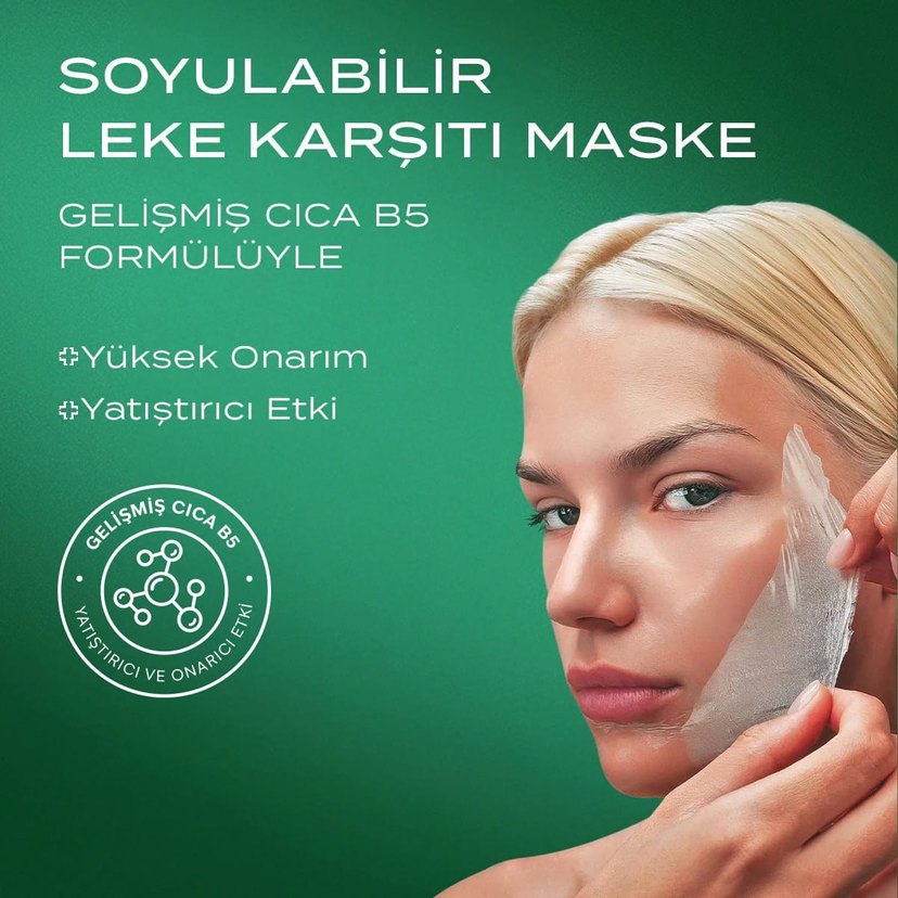 Gelişmiş Cica B5 formüllü soyulabilir sivilce karşıtı maske, yüksek onarım ve yatıştırıcı etki sağlar.
