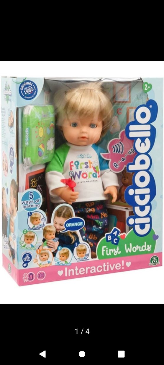 Renkli Cicciobello bebek, ilk kelimeleri öğreten 5 öğrenme modu ve küçük kitap aksesuarı ile etkileşimlidir. ( sadece kutusu yoktur...)2 yaş ve üzeri için uygundur.