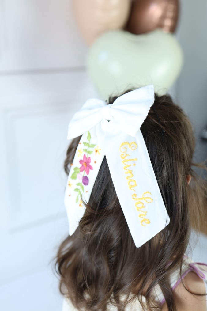 Pastel çiçek baskılı ve yazılı beyaz fiyonklu saç bandı, bohem tarz için uygundur.