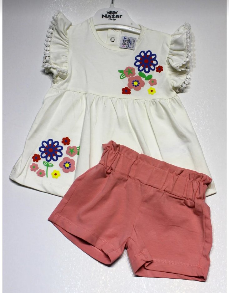 0-9 Ay 1 Yaş beden seçenekleri mevcuttur Kısa kollu beyaz üst, renkli çiçek baskısi ve fırfırlı kollara sahip. Pembemsi şort detaylı