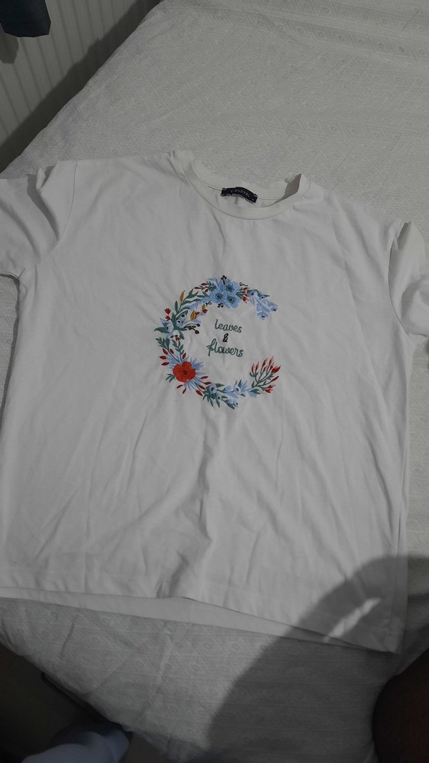 Kısa kollu, yuvarlak yakalı beyaz tişört, çiçek baskılı ve rahat kesimli, günlük kullanım için uygundur.