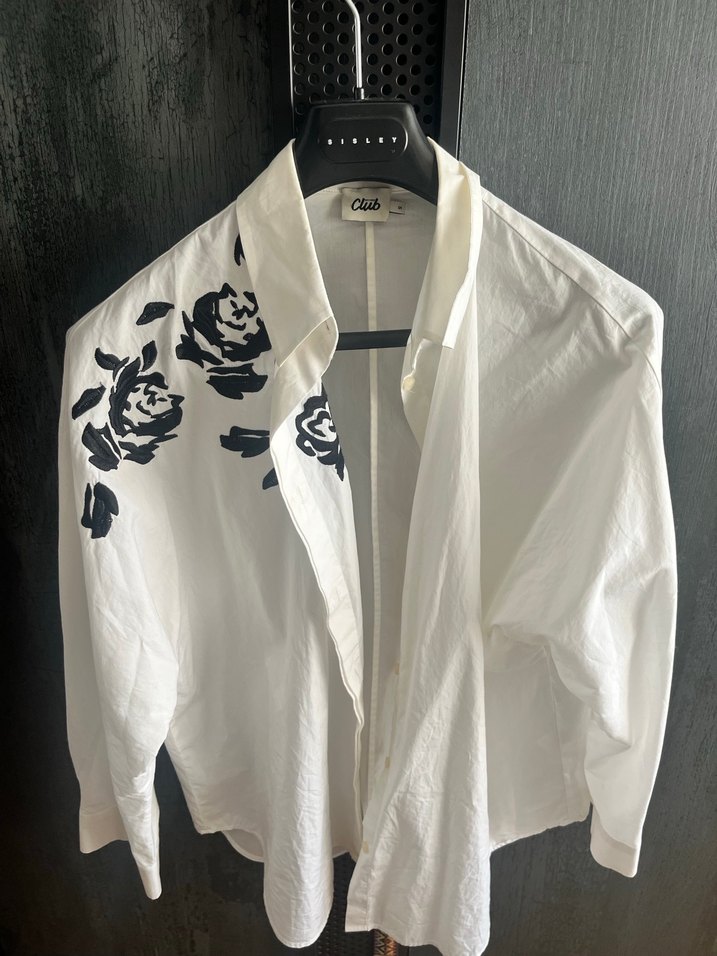 Notched lapel yakalı, düğmeli, beyaz pamuklu, omuzda koyu renk çiçek baskılı, bol kesim kadın gömlek. Ofis ve sokak stiline uygun.