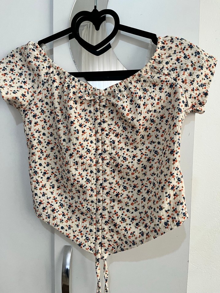 Çiçek baskılı kırık beyaz kadın bluz etek takım V yaka, kısa kollu ve normal boyda, bohem tarzına uygun sokak giyimi için ideal. Bluzu büzgülü istediğiniz şekilde kullanabilirsiniz