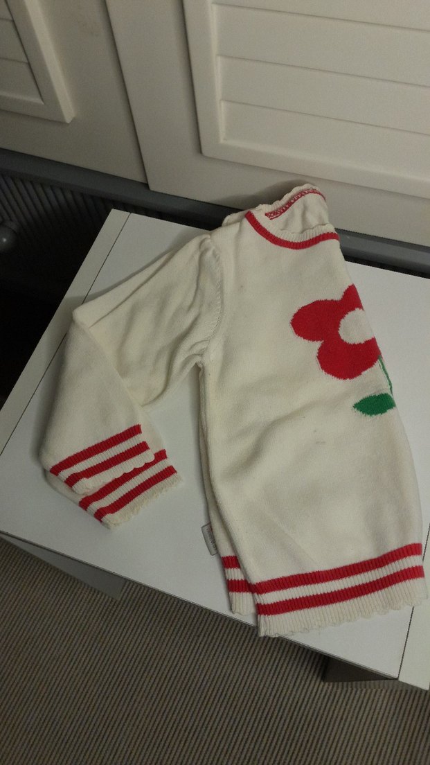 Uzun kollu, bisiklet yaka ve fitted kesime sahip kız çocuk kazağı. Yumuşak ve sıcak kumaştan, renkli çiçek baskılı ve kırmızı çizgili manşet ile etek ucu detaylıdır.