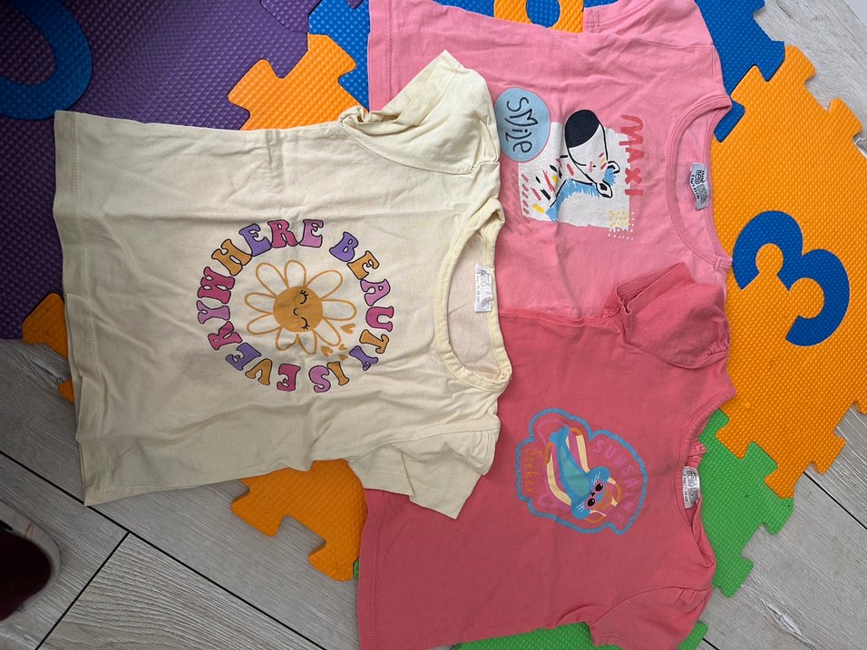 Kısa kollu, bisiklet yaka, düğmeli ve baskılı çiçekli renkli kız tişörtü. Yumuşak sentetik kumaştan yapılmıştır.