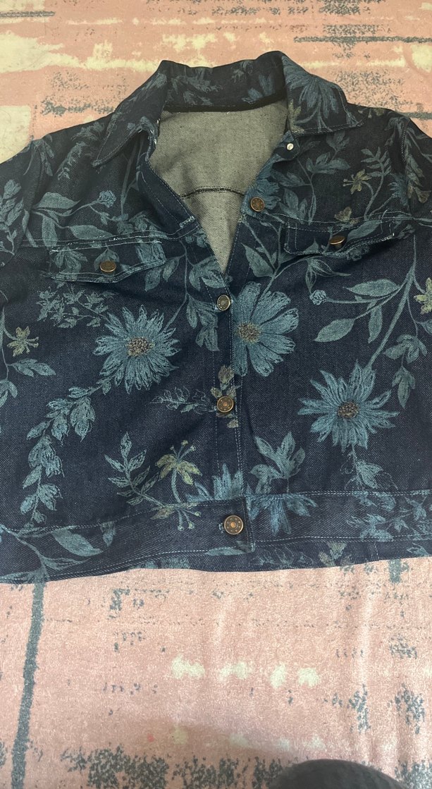 Düğmeli, çiçek baskılı mavi denim ceket. Geniş kesim, uzun kollu ve normal uzunlukta, bohem tarzda. El dikimi kendi dikimim dir