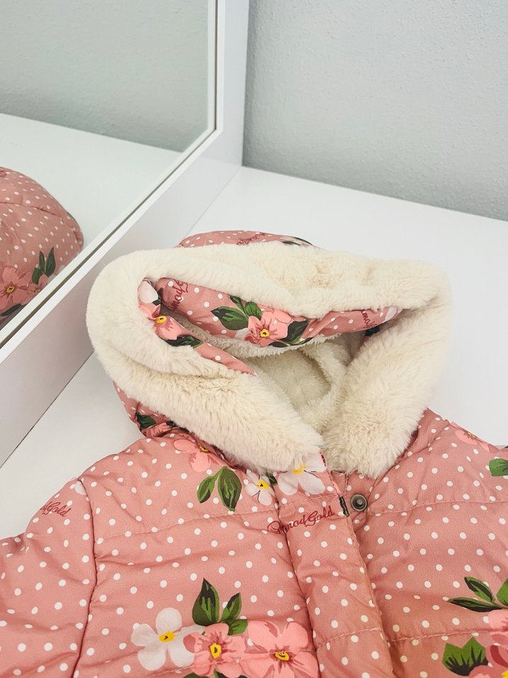 Yumuşak kürklü kapüşon ve çiçek baskılı desenli, sıcak fleece kumaştan yapılmış, fitted kesim pembe kız mont.