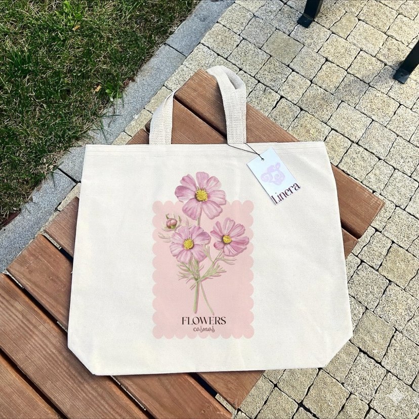 Pamuklu, pastel pembe renkte, çiçek baskılı kadın çanta. Bohem tarzıyla günlük kullanıma uygun, sağlam saplı.