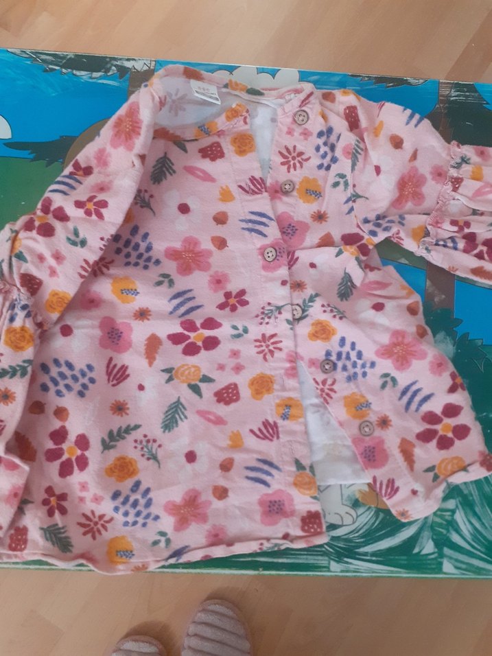 Yumuşak kumaştan yapılmış, düğmeli ve yakalı, pastel pembe çiçek desenli, bol kesim uzun kollu