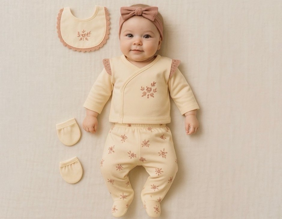 %100 pamuktur. Zarif çiçek nakış detayları ve sade şıklığıyla öne çıkan bu bebek seti, yenidoğanların hassas cildi düşünülerek tasarlanmıştır. Yumuşak dokulu kumaşı sayesinde bebeğinize gün boyu konfor sağlar. Günlük kullanım, hastane çıkışı ve özel anlar için ideal bir settir. Set içeriği: 1 Adet Üst 1 Adet Alt 1 Adet Önlük 1 Çift Eldiven 1 Adet Şapka
