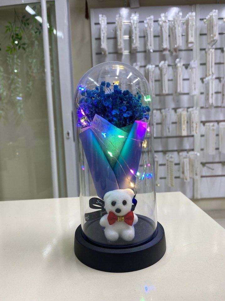 Çiçek buketli minik ayıcıklı cam fanus büyük boy