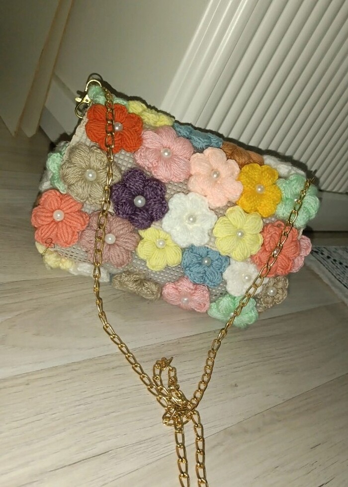 Çiçeklerin her biri elle teker teker örülmüştür.çantadan elimde son adet kaldığı için fiyatı düşük tuttum teklif göndermeyin lğtfen