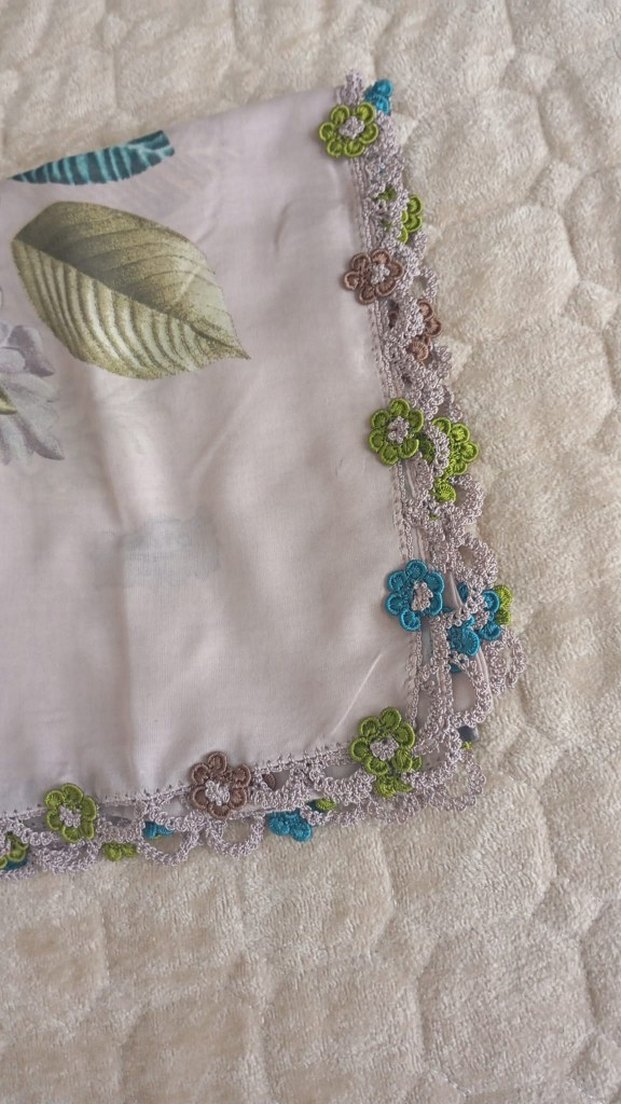 Kadınlar için gri renkli tekstil fular, renkli çiçek dantelli kenar süslemeleriyle bohem tarzını yansıtıyor.