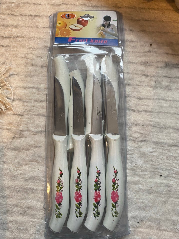 Beyaz saplı ve pembe çiçek desenli dört adet meyve bıçağı seti. Saplar açık renklidir ve şık bir görünüm sunar.